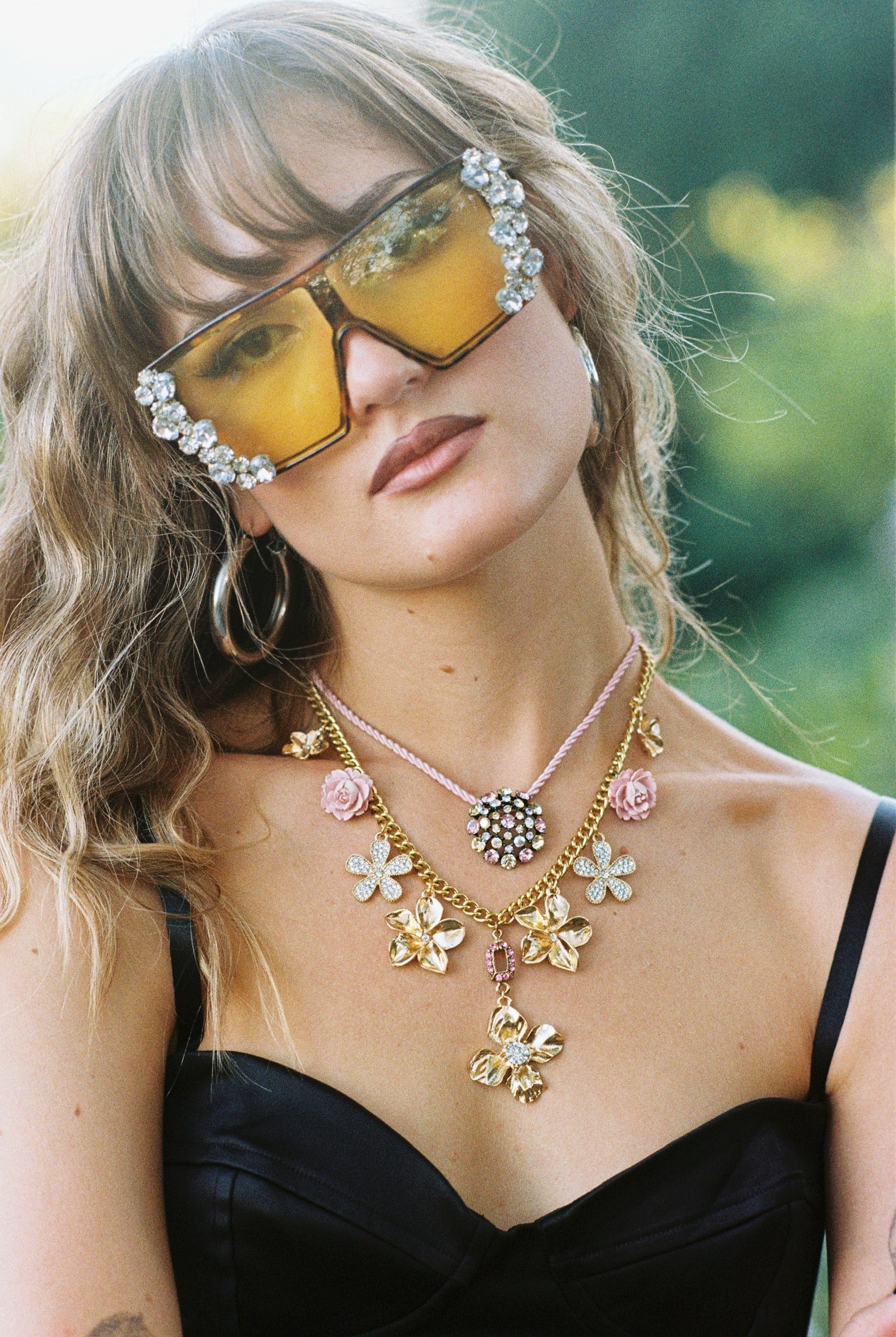The Mother Magnolia Necklace is a sweet design of repurposed flower earrings and charms on a delicate gold chain with pink accents. Sitting slightly lower on the neck making it perfect for stacking and low-cut necklines.
