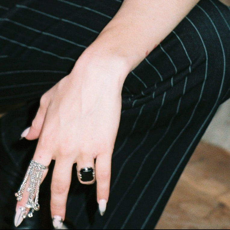 Rain Ring is a collection of repurposed silver chains with rhinestones and silver beads at the base creating a rain-like look when hanging by your side. This design moves where you go and is super fun to wear.