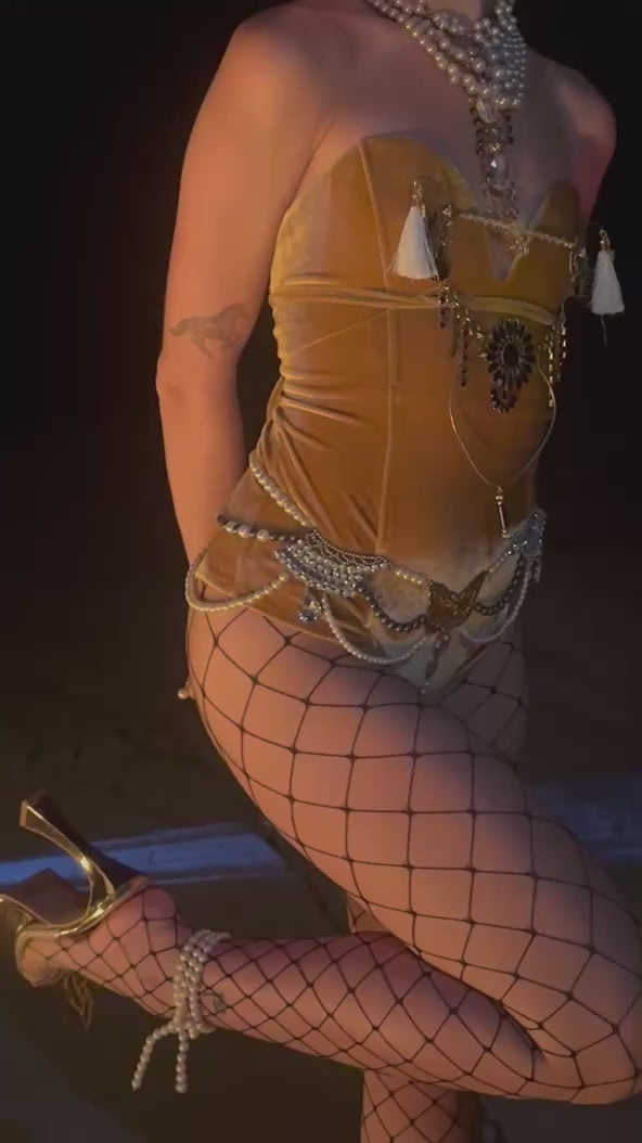 A one-of-a-kind, Moulin Rouge-inspired pearl skirt handcrafted from recycled pearls and necklaces. Featuring a gold butterfly centerpiece, cascading strands of cream and deep purple pearls, and rhinestone details, this piece exudes vintage showgirl glamour.